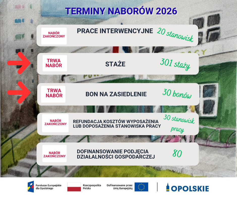 Terminy naborów na finansowanie form wsparcia bezrobotnych i poszukujących pracy niepozostających w zatrudnieniu w 2026 roku w ramach Funduszy Europejskich. - Powiatowy Urząd Pracy w Opolu