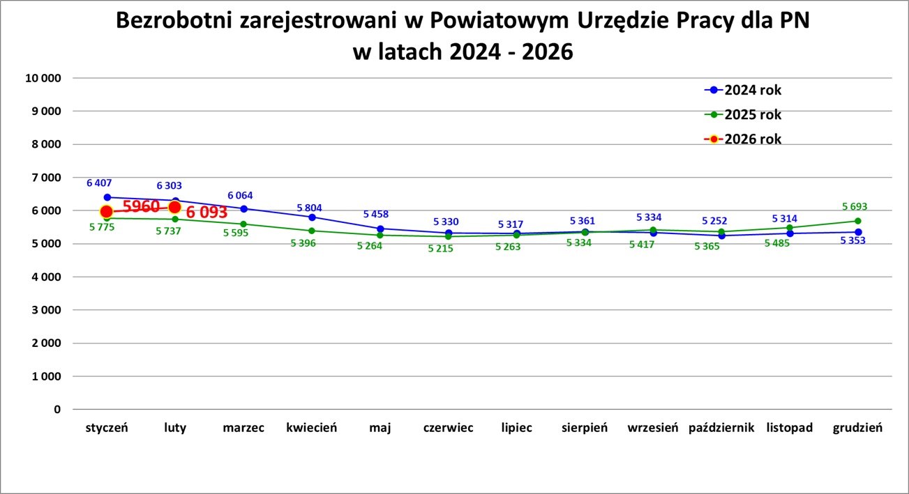 Na dzień 28.02.2026 r. liczba zarejestrowanych bezrobotnych wynosiła 6 093 osoby. W lutym 2026 r. wystąpił wzrost liczby osób bezrobotnych w stosunku do stycznia...
